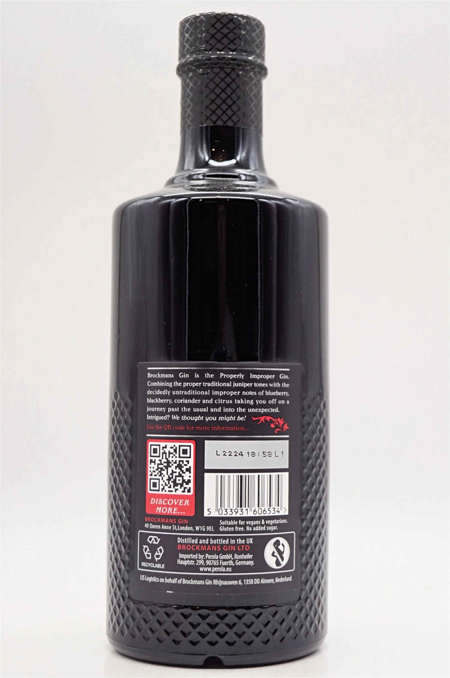 BROCKMANS Gin aus England wird ausschließlich unter Verwendung von 100%-igem Getreide-Neutralalkohol in traditionellen Destillationsapparaten aus Kupfer hergestellt. Alle pflanzlichen Komponenten werden vor dem Destillieren 24 Stunden lang in dem Neutralalkohol eingelegt, damit sich ihre Aromen ausreichend entfalten.